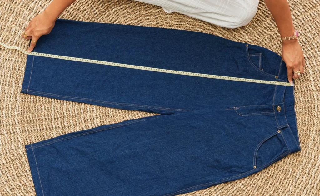 Posez le pantalon bien à plat. Mesurez depuis le haut de la ceinture (bord supérieur) jusqu’au bas de l’ourlet. Cette mesure donne la longueur totale du pantalon, de la taille jusqu’au bas de la jambe.