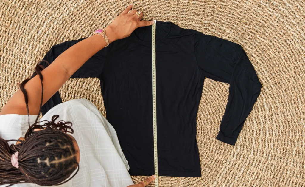 Mesurez depuis le point le plus haut du top, au niveau de l’encolure, jusqu’au bas du vêtement.