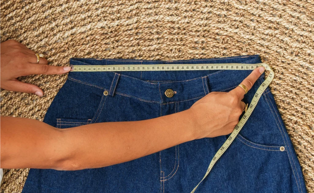 Posez le pantalon bien à plat, fermeture éclair et bouton fermés. Mesurez la largeur de la taille d’un côté à l’autre. Pour un jean ou un pantalon avec taille élastique, étirez légèrement avant de mesurer. Multipliez par 2 pour obtenir le tour de taille complet.