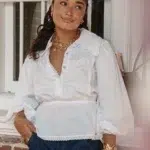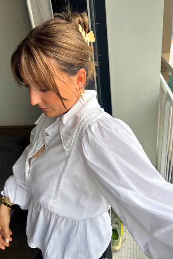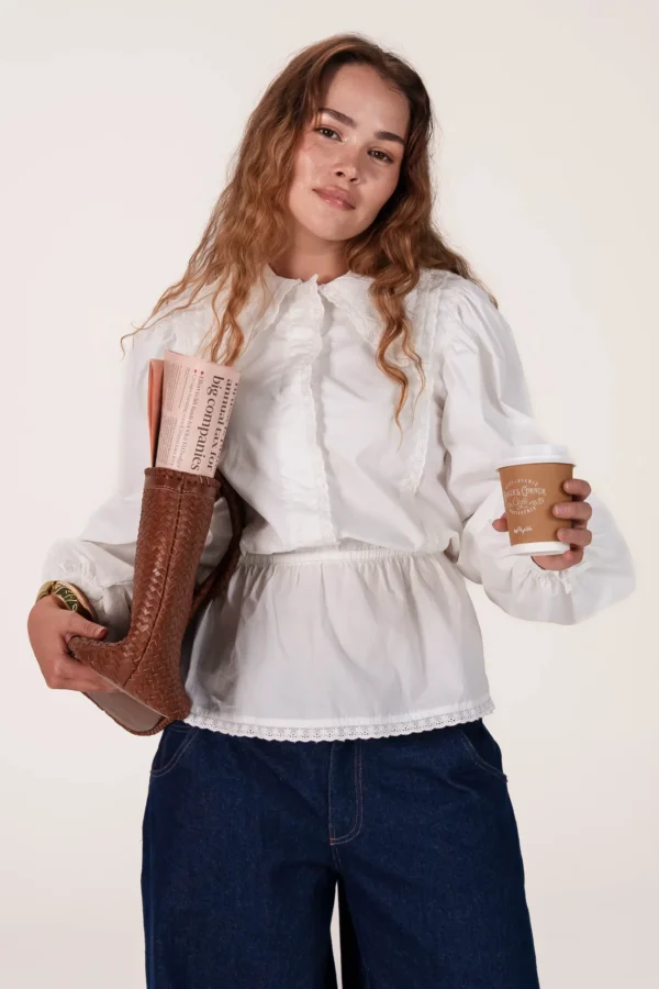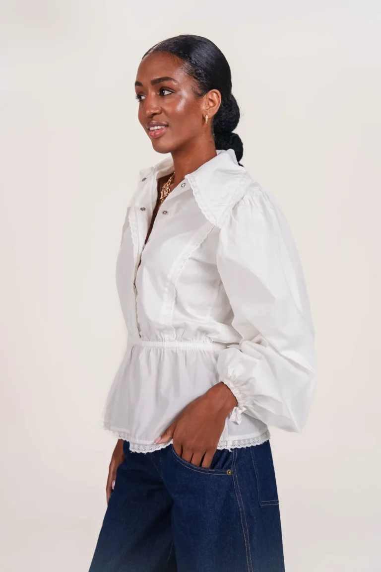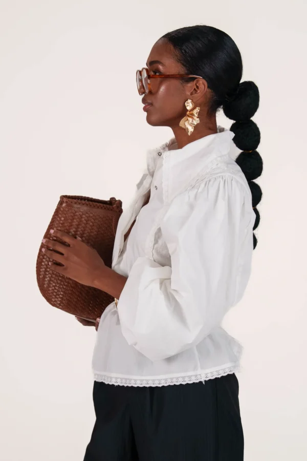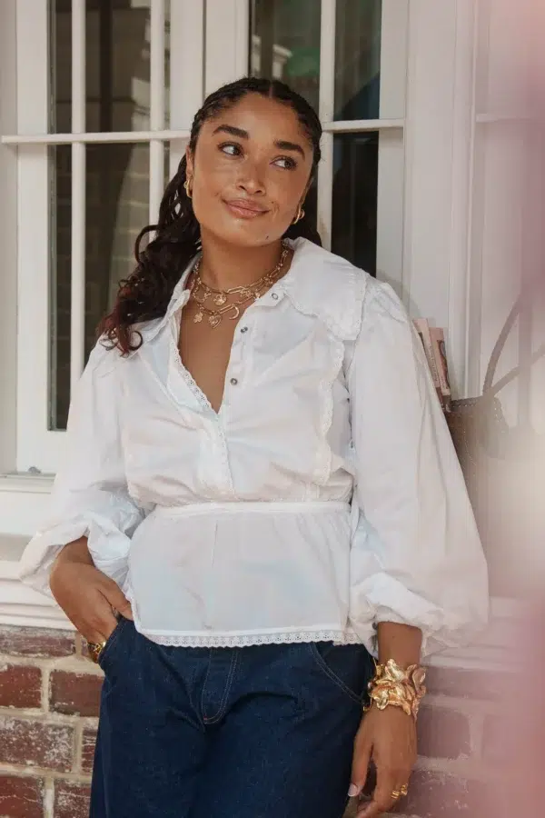 On a créé le chemisier de nos rêves (& des vôtres). Un tissu 100% coton biologique certifié GOTS, pensé durabilité pour s’assurer que vous puissiez la reporter dans 10 ans. Des manches bouffantes, de la broderie et une ceinture dissimulée de quoi le resserrer à la taille.